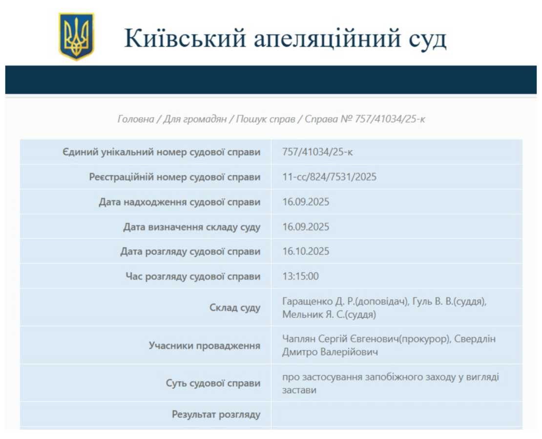 Київський апеляційний суд кілька разів переносив слухання і станом на початок жовтня рішення ще не було ухвалене. Після журналістського запиту про рух справи про заставу для Свердліна, справа знову з’явилась у розкладі суду. Засідання, яке заплановане на 16 жовтня, може стати вирішальним.