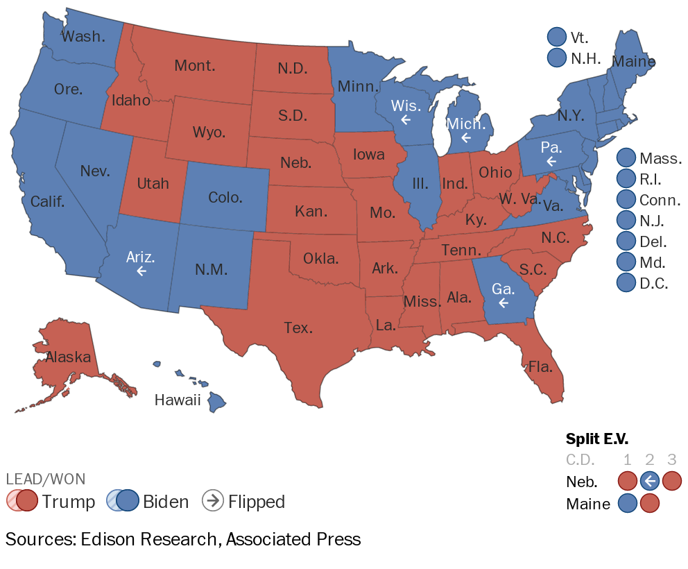 Республіканець Трамп без доказів заявив, що його обдурили широкомасштабною фальсифікацією виборів і відмовився поступитися. Державні виборчі чиновники не повідомляють про серйозні порушення, і кілька його судових оскаржень зазнали невдачі в суді.
