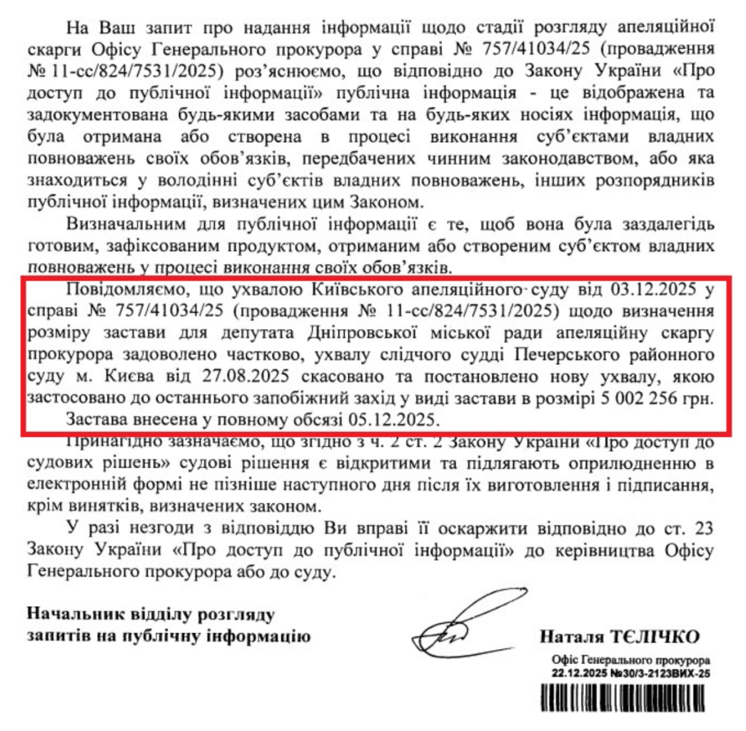 Після численних запитів журналістів Генеральна прокуратура офіційно підтвердила, що розмір застави для депутата Дніпровської міськради Дмитра Свердліна переглянули. На момент підготовки матеріалу у судовому реєстрі ще не було даних про це.