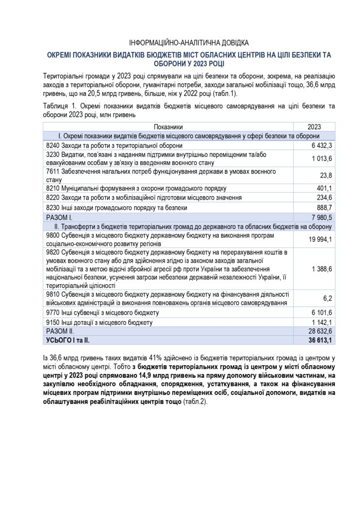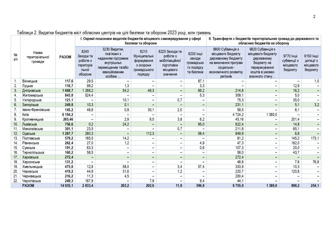 Зокрема, на заходи та роботи з територіальної оборони місто направило найбільшу частину від згаданої суми – 1 млрд 268 млн 200 тис. гривень. На заходи громадського порядку та безпеки – 69,2 млн грн. На видатки, пов’язані з підтримкою внутрішньо переміщених осіб, – 54, 2 млн грн. На муніципальні формування з охорони громадського порядку – 46,3 млн грн.