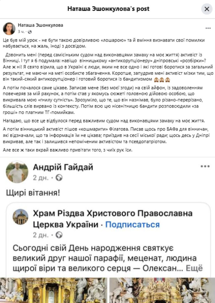 “Дзвонить мені (перед самісіньким судом над виконавцями замаху на моє життя) активіст із Вінниці. І тут я б подумала: навіщо вінницькому “антикорупціонеру” дніпровські “розбірки”? Але ж ні! Я свято вірила, що в Україні є люди, яким не все одно і які готові боротися за загальний результат, не маючи на меті особисте збагачення. Коротше, запудрив мені активіст мізки тим, що він такий-сякий антикорупціонер і готовий боротися із бандитизмом.