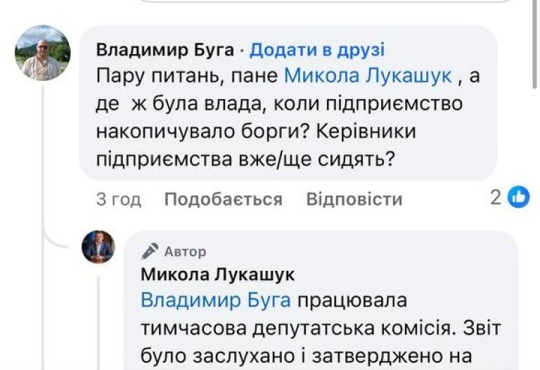Публікація Лукашука викликала питання навіть у простих користувачів соцмереж, далеко не посвячених у інформацію про те, що голова облради насправді був згоден прийняти проблемне підприємство під свою опіку.