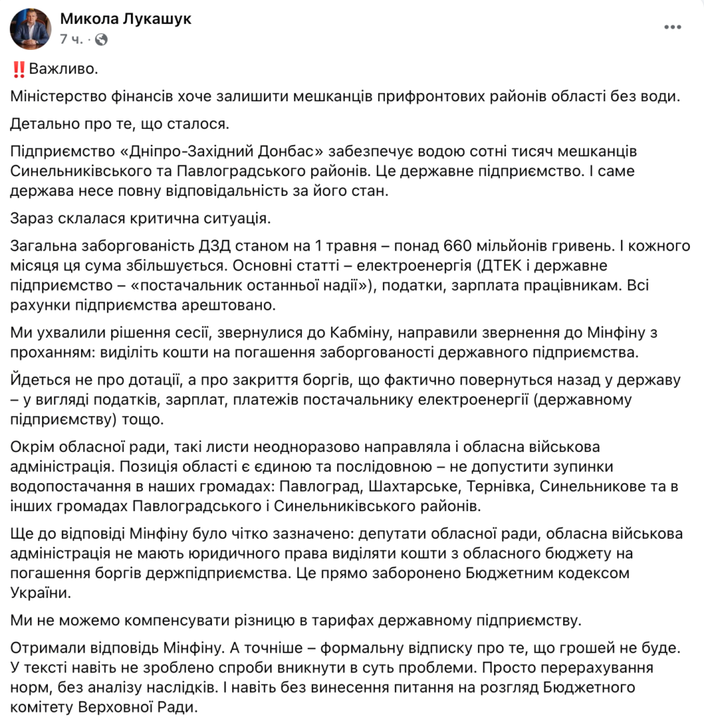 У своєму дописі на Facebook голова Дніпропетровської обласної ради Микола Лукашук вказав, що зараз Мінфін відмовився надати кошти на покриття майже 700 млн грн боргів стратегічного підприємства “Дніпро-Західний Донбас”, яке забезпечує водою мешканців Синельниківського та Павлоградського районів: