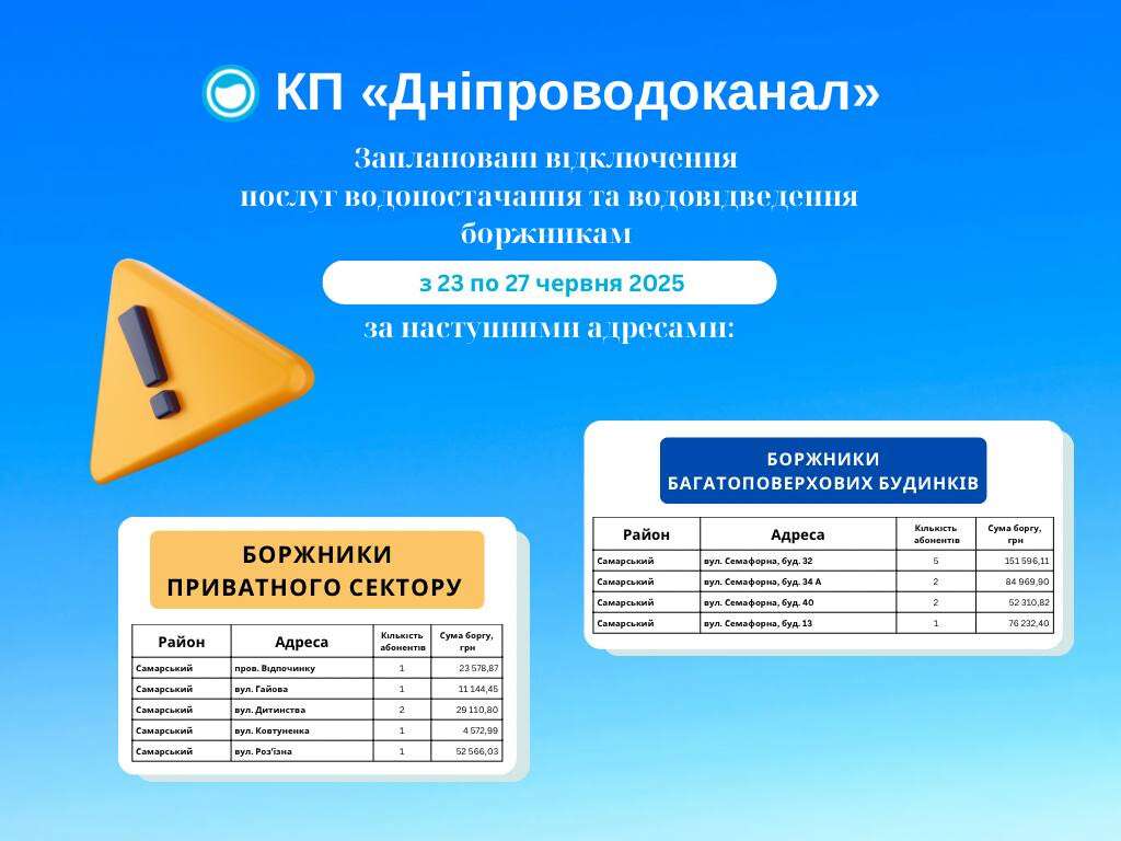 КП «Дніпроводоканал» продовжує обмеження послуги водопостачання та водовідведення боржникам. Про це повідомляє Дніпровська порадниця з посиланням КП “Дніпроводоканал”.