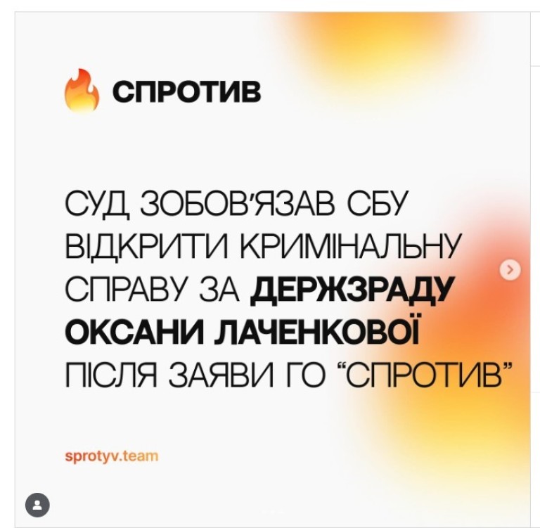 “Сьогодні, 1 липня, Шевченківський районний суд міста Дніпра задовольнив нашу скаргу від ГО «СПРОТИВ» на бездіяльність СБУ у Дніпропетровській області та зобов’язав СБУ відкрити кримінальну справу про державну зраду Оксани Лаченкової, матері провладного блогера Лачена”, – написала Марія Барабаш.