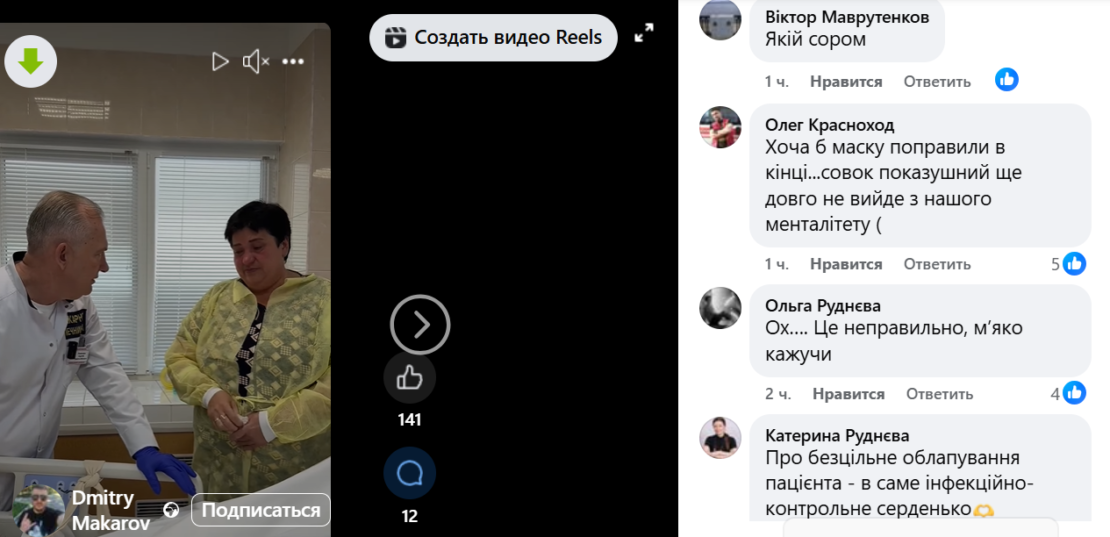 “…Ніколи не можна забувати, що ми не меблі крутимо, а лікуємо хворих людей, – написав лікар Дмитро Макаров, коментуючи відео Риженка – …Я не казатиму про те, що неввічливо хлопать по плечу і тріпати волосся незнайомій людині. Не казатиму навіть про те, що хапатись за людей з посттравматичним стресом шкідливо і небезпечно. Але й**бані зябра – поставить поруч з тяжкопораненим його дружину, продемонструвати їй чоловікові рани і заслухати доповідь про тяжкість стану, знімаючи на телефон, як вона плаче?… Вважаю, що це – верх цинізму і байдужості до людей. І нах*ра? Щоб сказати в камеру “спасіння – це наша робота”? Сподіваюсь, що автори просто не розуміють, як це виглядає”