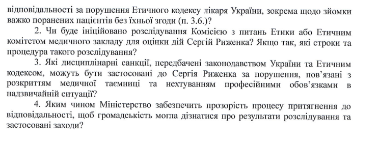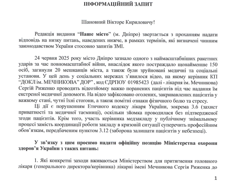 Видання “Наше місто Дніпро” також спрямувало запит до Міністерства охорони здоров’я з вимогою дати чітку оцінку діям Риженка та відреагувати на численні випадки неетичних та фактично протизаконних зйомок пацієнтів лікарні без їх згоди. Втім очільник МОЗ пан Ляшко досі не відреагував на вчинки очільника обласної лікарні, – міністерство, за сталою бюрократичною традицією, переадресувало запит на нижчі щаблі своєї чиновницької вертикалі.