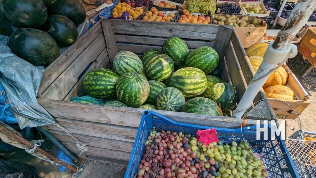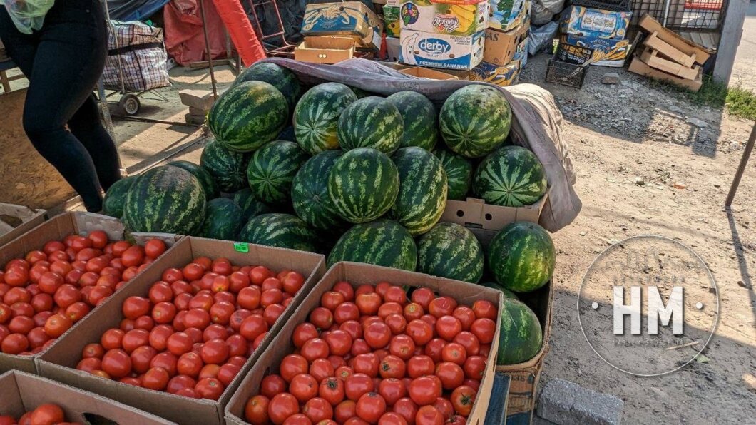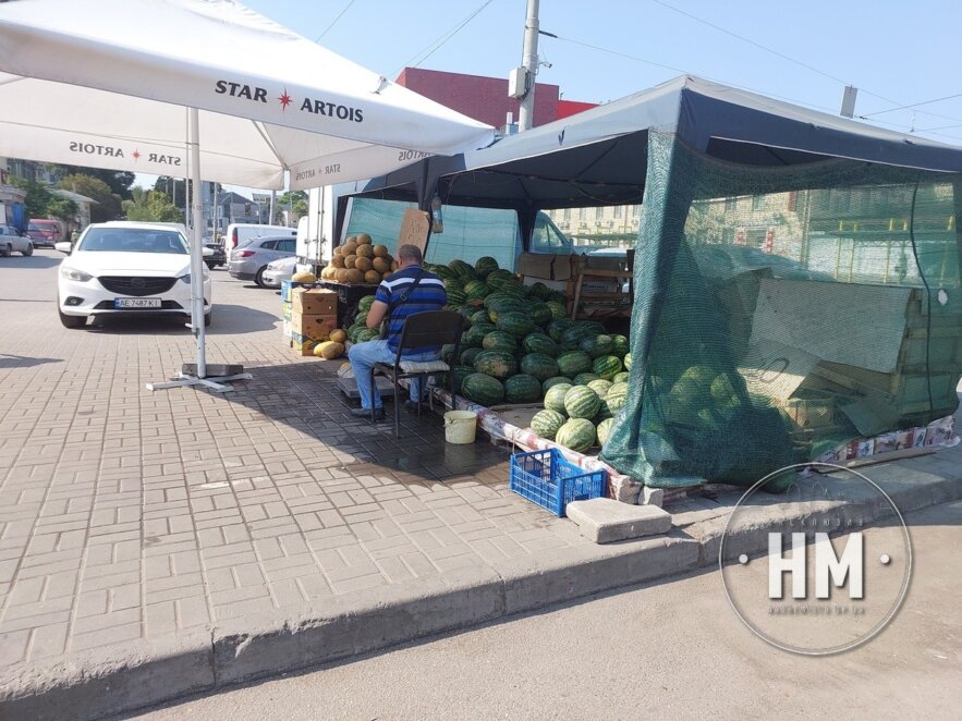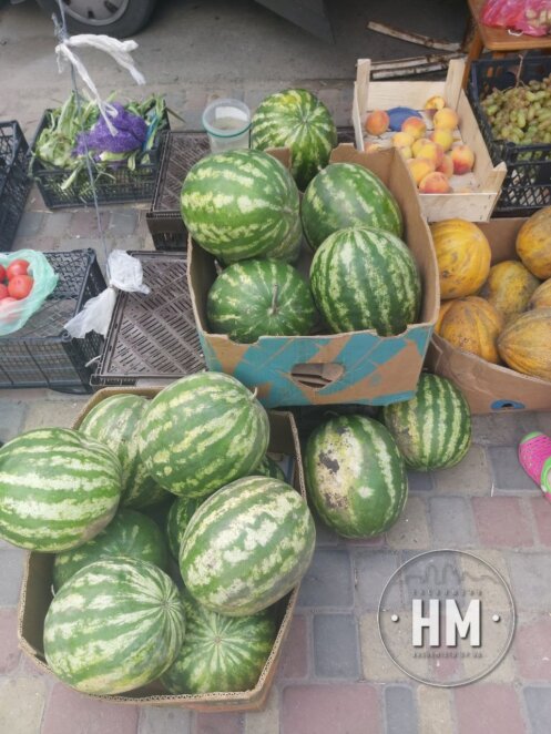 Біля цього ринку було дві точки торгівлі баштанними. В обох наметах переважна кількість кавунів лежить на піддонах, що не може не тішити. Але все ж таки на підлозі було ще близько десяти штук. Ціна – 20 грн за кілограм в обох наметах. У першому, що біля стіни, кавуни були привезені з Одещини, а в другому, що ближче до дороги — з Херсонщини.