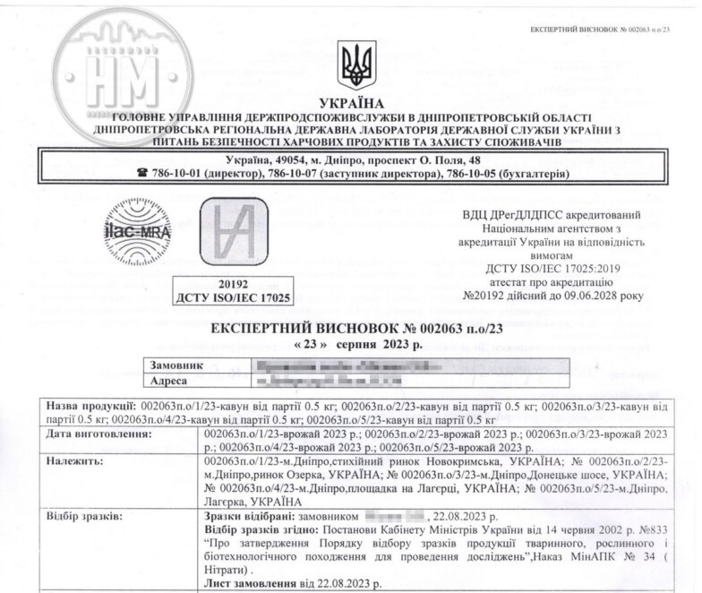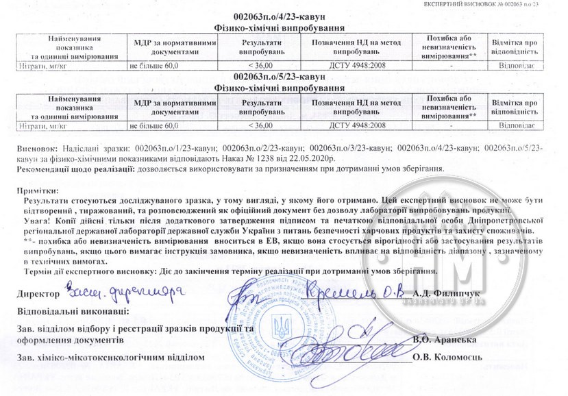 Ми теж вирішили купити у продавчині кавун, який коштував 18 гривень за кілограм, та відправити його на експертизу до Дніпропетровської державної лабораторії державної служби України з питань безпеки харчових продуктів та захисту споживачів. Результат експертизи, який ми отримали наступного дня, показав, що вміст нітратів у зразку нашого кавуна у межах норми, і він придатний для споживання.