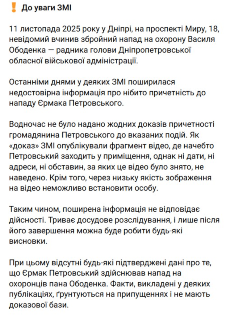 Вірогідно, представники Олександра Петровського («Нарік»), який з початку війни перебуває у Відні, оприлюднили заяву, у якій заперечується причетність його сина Єрмака до стрілянини у Дніпрі та фактично звинувачується у поширенні недостовірної інформації низка українських медіа.