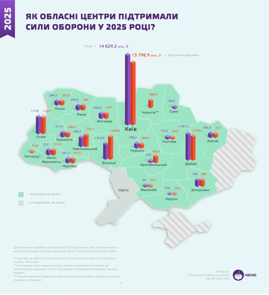 Водночас у прифронтовому Харкові, який перевищує Дніпро за кількістю населення, допомога Силам оборони у 2025 р. склала лише 217 млн грн. Експерти та військові обурені тим, що влада Харкова під керівництвом Ігоря Терехова витрачає ресурси на непріоритетні напрямки, заграє з виборцями, влаштувавши “безкоштовний транспорт”, та накопичує катастрофічні борги за енергоносії – замість ефективної допомоги ЗСУ.