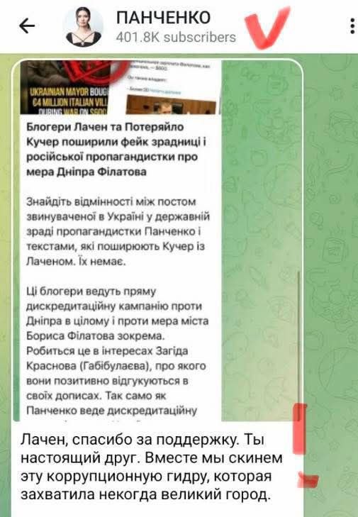 Блогери Ігор Лаченков (Лачен) та Тимофій Потеряйло (Кучер) поширили російський фейк, розміщений на китайському ресурсі з вигаданою інформацією про нібито нерухомість мера Дніпра Бориса Філатова в Італії, назвавши це «міжнародним скандалом». Першоджерелом матеріалу стала відома колаборантка Діана Панченко — і показово, що сама Панченко у наступному дописі публічно назвала Лаченкова своїм другом, подякувавши йому за поширення матеріалу. Про це повідомляє “Дніпро Головне” з посиланням на “Наше місто”.