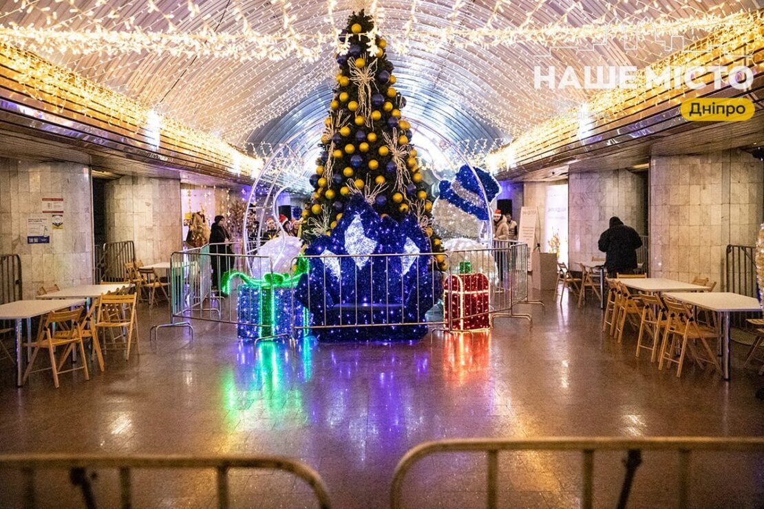 Цьогоріч головна новорічна ялинка міста Дніпра встановлена у незвичайному місці — станції міського метро. Це рішення було прийняте враховуючи потребу забезпечення безпеки мешканців міста. Оформлення станції в стилі новорічної казки включає яскраві гірлянди, атмосферні інсталяції та різдвяний сніговик. Відкриття головної ялинки стало особливим подією для пасажирів метро, які щодня використовують міський транспорт для поїздок.