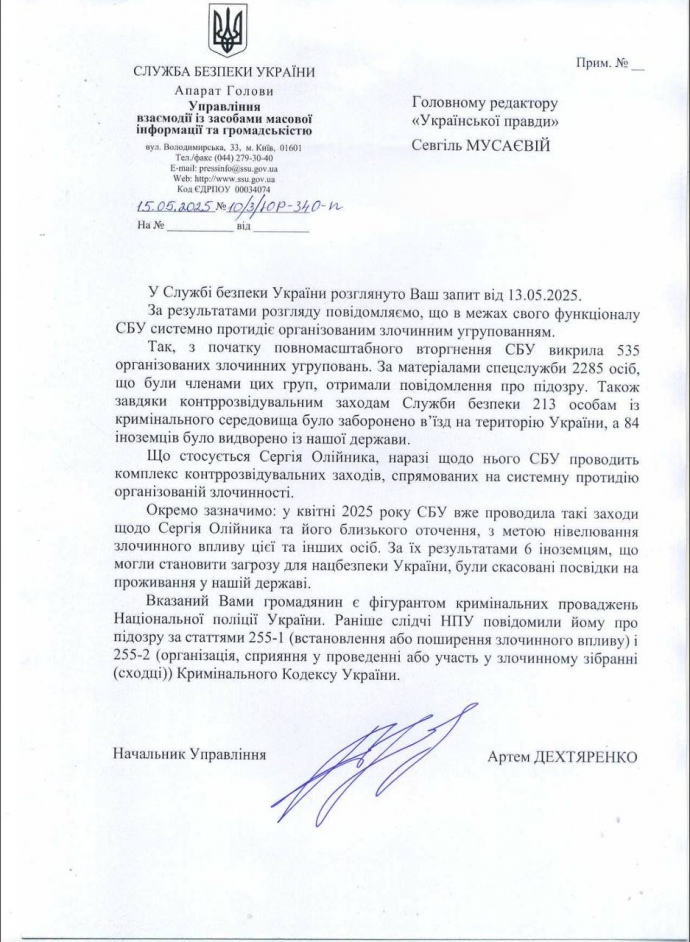За даними СБУ, у квітні 2025 року вже проводилися заходи для нейтралізації впливу Олійника та його найближчого оточення.