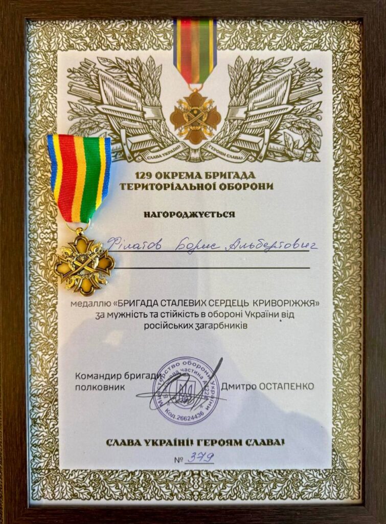 «Сьогодні всіх нас нагородили медаллю “Сталевих сердець” від 129-ї криворізької бригади ТрО», – мер Дніпра Борис Філатов