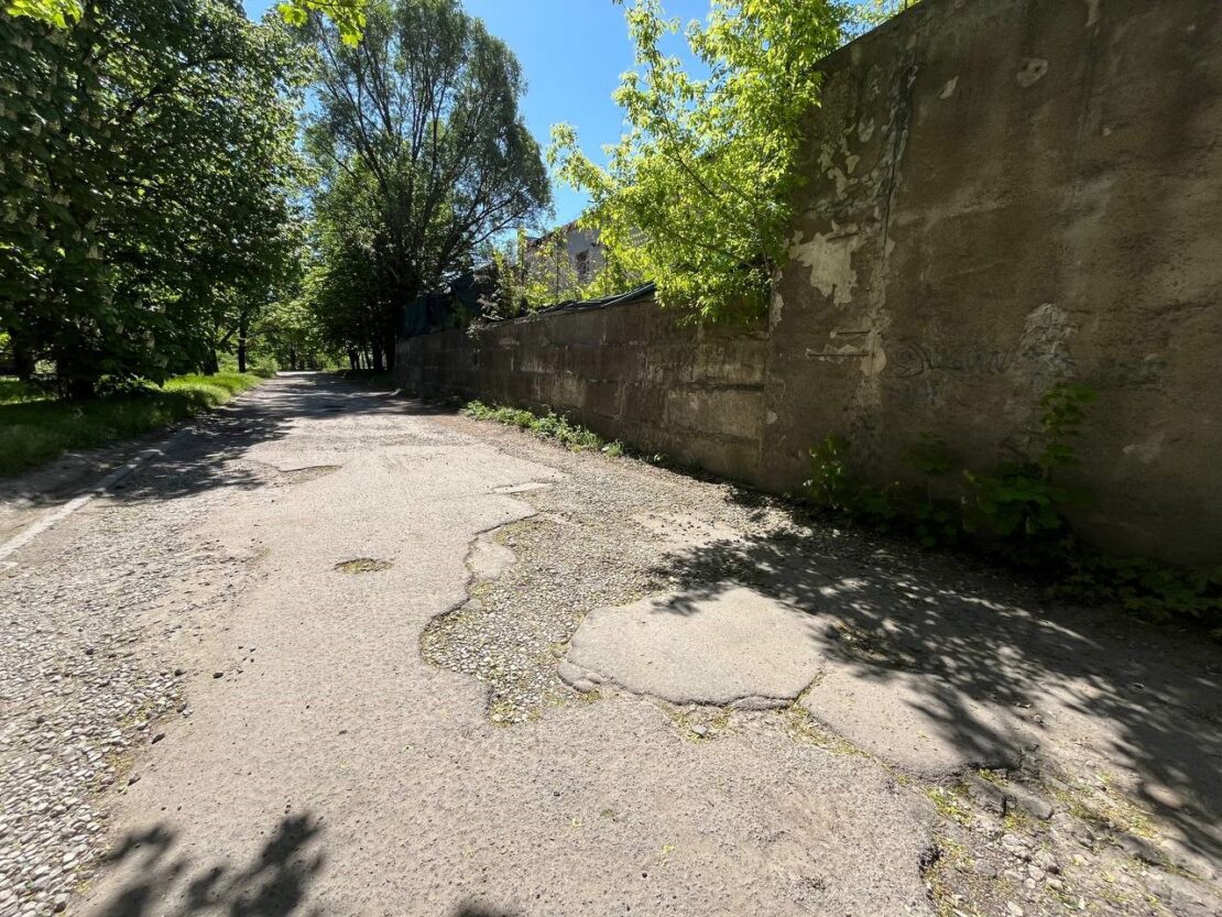Дорога між 9 та 13 корпусами добиває враження — це суцільне полотно з розбитого асфальту, щебеню та хаотичного каміння. Огорожа, що тягнеться вздовж, виглядає як декорація до постапокаліптичного трилера.