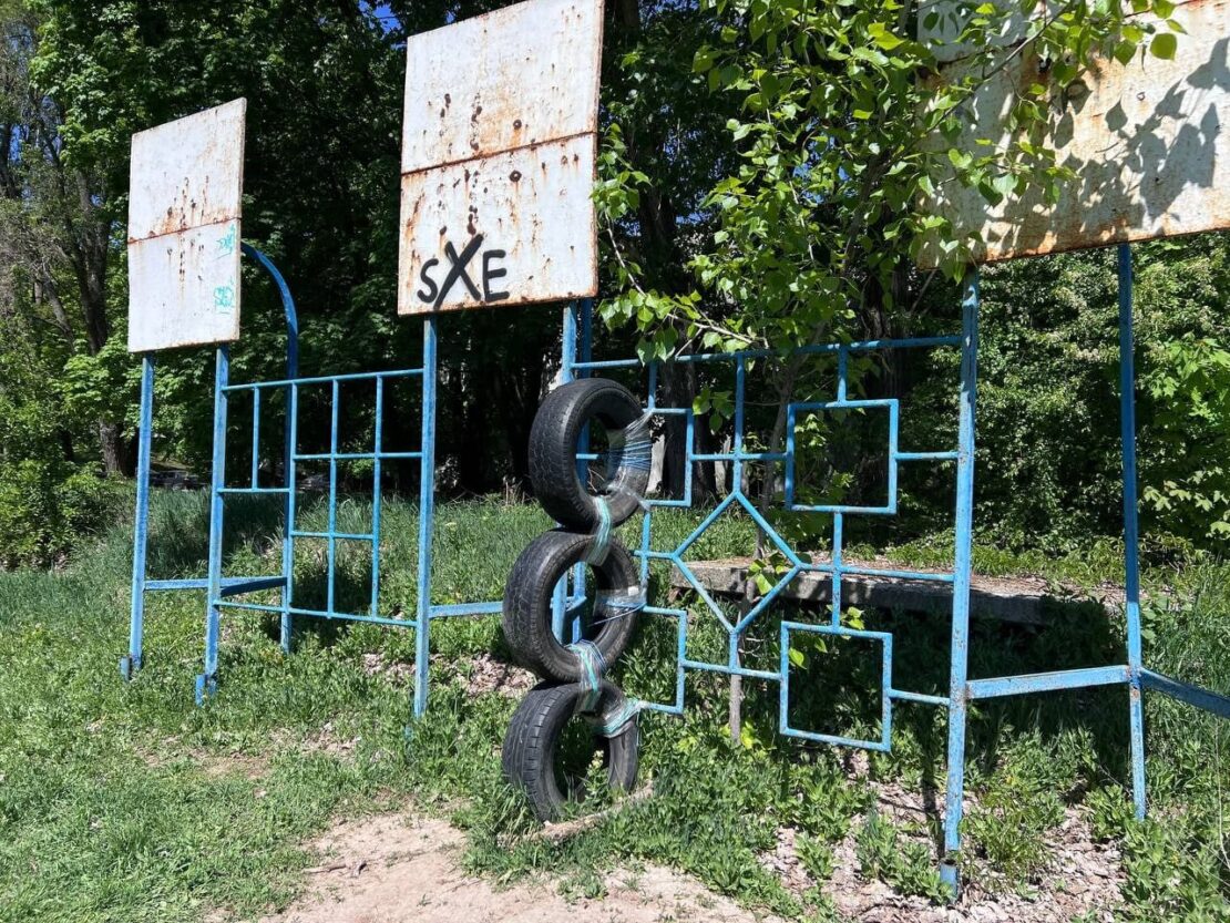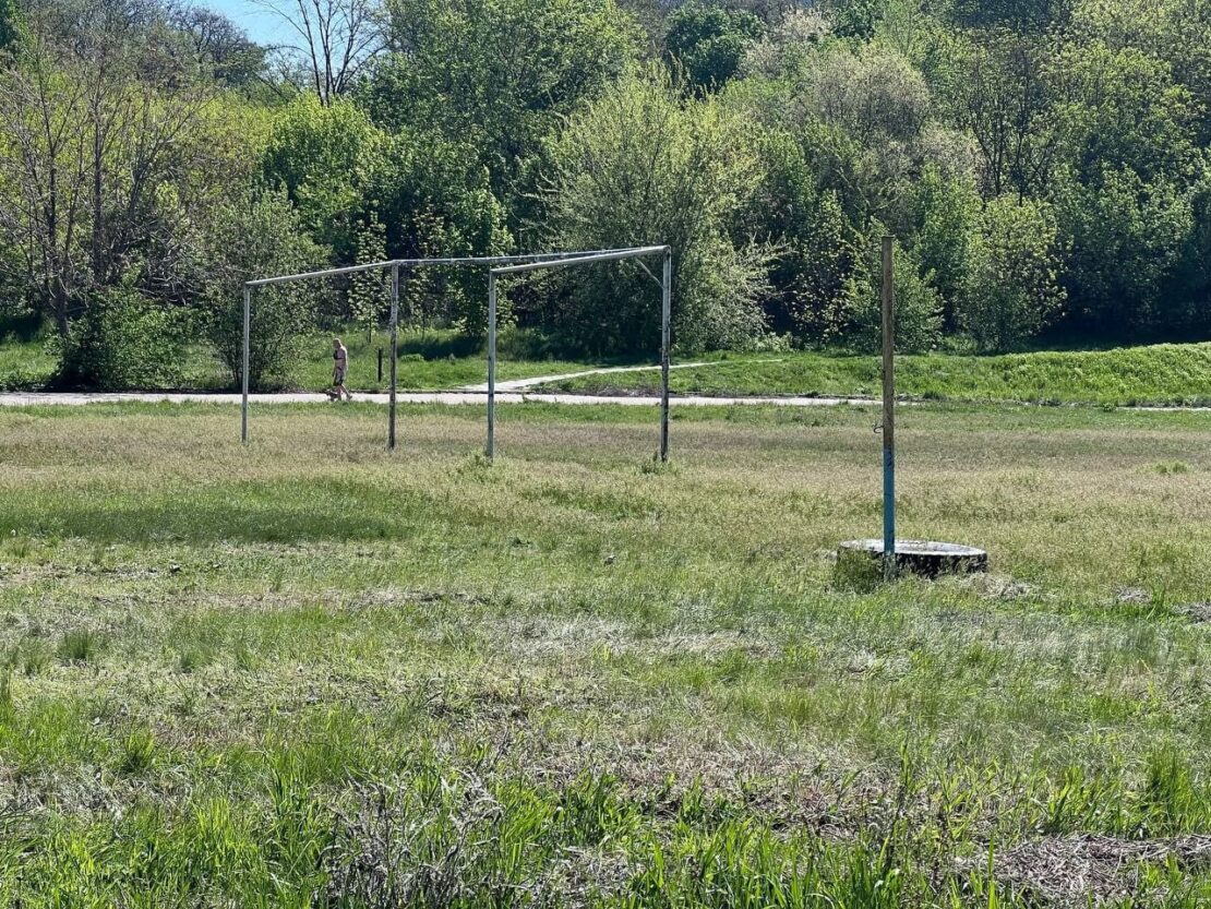 Колись сучасне футбольне поле зараз нагадує локацію з фільму “Сталкер”: ворота без сітки, заросла трава, а поруч — напіврозвалений спортивний майданчик.