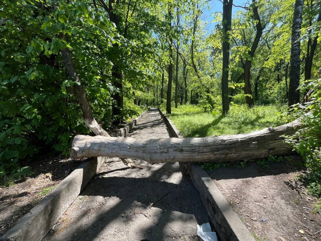 У студентському парку давним-давно впало дерево та перегородило стежку. Час йшов, дерево ніхто не прибрав, воно висохло й студенти прикрасили його написами.