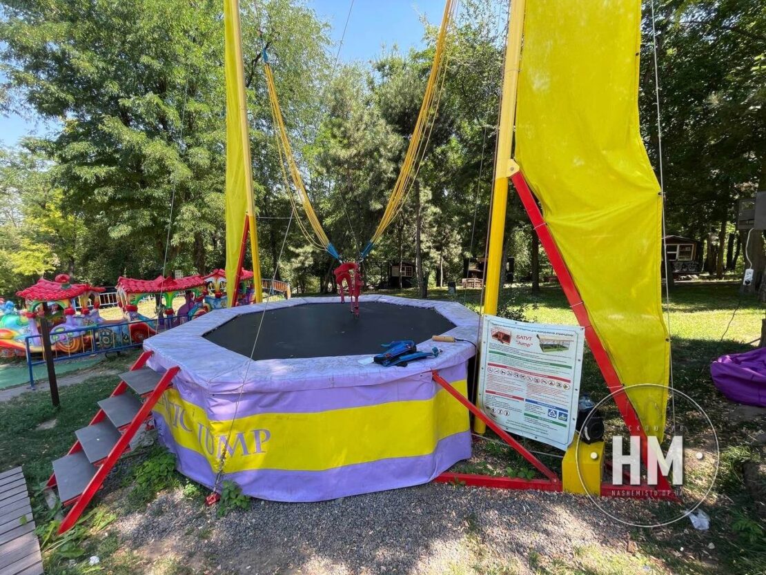 Також у парку є атракціон «Стрибки на батуті з резинкою». Відповідальний Кирило розповів, що сюди допускаються діти віком від 2 років і до 35 кілограм. Ціна такої розваги 100 гривень за 3 хвилини. тракціон виглядає безпечним, троси у гарному стані.
