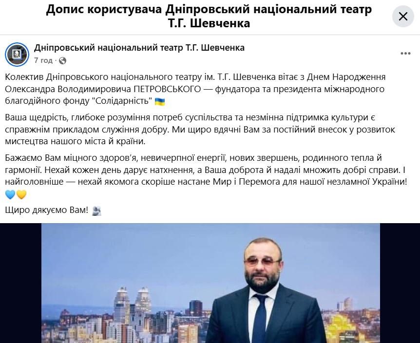 Дніпровський національний театр імені Тараса Шевченка продемонстрував зразкову відданість своєму “головному благодійнику”, опублікувавши зворушливе привітання з днем народження Олександра Петровського, більш відомого в певних колах як кримінальний авторитет Нарік.