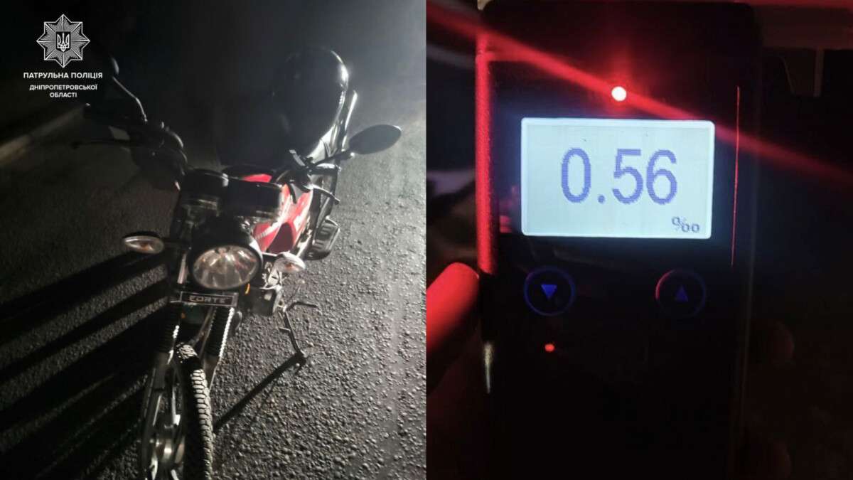 Інцидент стався уночі в Амур-Нижньодніпровському районі Дніпра. Патрульні зупинили мотоцикл марки Forte, водій якого порушив комендантську годину. Під час перевірки з’ясувалося, що за кермом перебував неповнолітній хлопець. Крім того, інспектори помітили у нього ознаки алкогольного сп’яніння. Юний водій погодився пройти перевірку за допомогою алкотестера Драгер. Результат – 0,56 проміле алкоголю у крові.