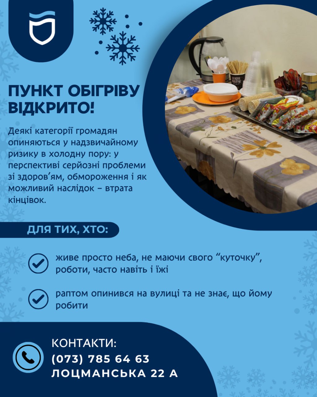У повідомленні йдеться, що при Міському центрі соціальної допомоги вже на повну працює пункт обігріву за адресою вул. Лоцманська, 22-А. Телефон: (073) 785 64 63.