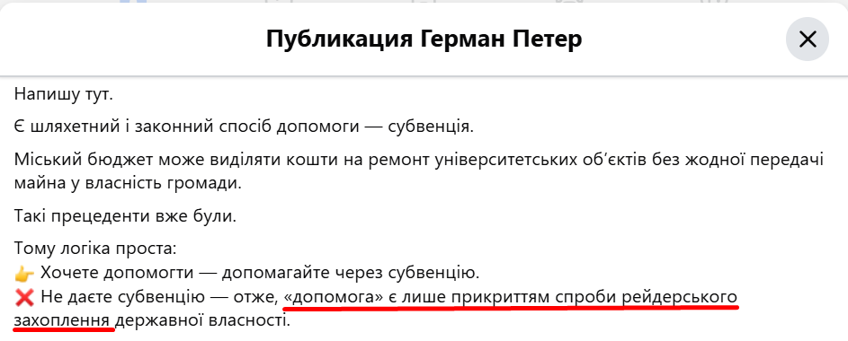 Однак у підсумку адміністрація ВНЗ на чолі з ректором Оковитим відреагувала на конструктивну пропозицію панічними повідомленнями у соцмережах, а проректор Дніпровського національного університету Петер Герман у своїх досить плутаних постах навіть заявив про нібито спробу “рейдерського захоплення”.