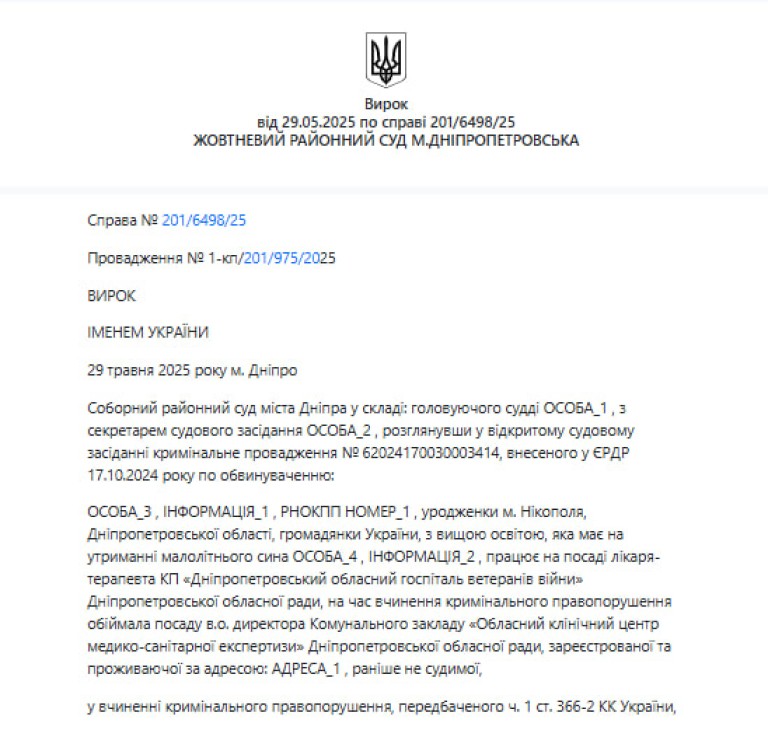 У травні 2025 року суд визнав колишню в.о. директорки Дніпропетровської обласної МСЕК Наталію Абраменкову винною у внесенні недостовірної інформації до декларації за 2023 рік. Жінка приховала майно на понад 3,26 мільйона гривень. Замість реального покарання з ув’язненням вона отримала штраф у 51 000 грн і річну заборону обіймати керівні посади у комунальних медзакладах.
