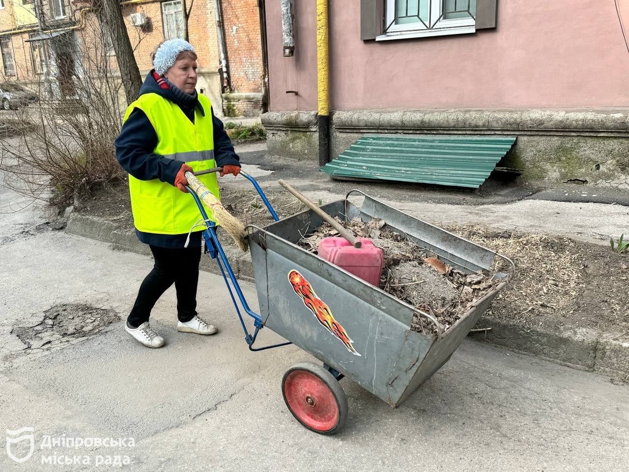 «Їхня робота міняється в залежності від сезону: восени та навесні вони прибирають опале листя та озеленюють кущі, взимку – прибирають сніг, а навесні приводять усе до ладу після зими. Для цієї роботи вони забезпечені всім необхідним інвентарем — новими мітлами, відрами, спеціальними тримерами-косарками, мають захисний одяг та інше. Також двірникам на допомогу виїжджає малогабаритна прибиральна техніка», — розповів представник департаменту житлового господарства Дніпровської міської ради Єгор Худяков.