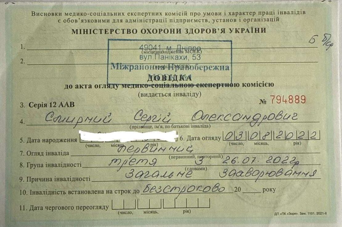 З початком повномасштабного вторгнення Сергій Смирний не пішов на фронт. Навпаки, у 2022 році він отримав статус непридатного до служби, бо тиждень до цього полежав з нирками у лікарні за що отримав 3 групу інвалідності від МСЕК та пенсію. Згідно з таким діагнозом потребує постійного діалізу, але, як бачимо на фото виглядає доволі гарно та життєрадісно.