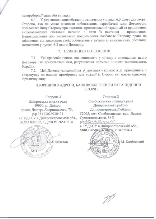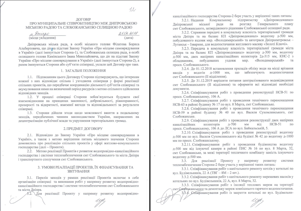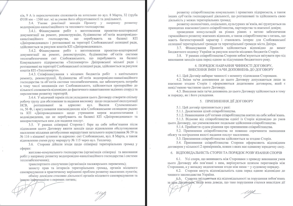 Аналіз договору 2018 року доводить, що селищний голова Слобожанського Іван Камінський взяв на себе конкретні зобов’язання та поставив на документі свій підпис. Громада, яку він очолює вже 35 років мала передати мережі у власність Дніпра, профінансувати реконструкцію котелень, встановити прилади обліку. Проте вийшло так, що той, хто слово дав, той його і забрав, та залишив 15 мільйонів гривень боргів лише за тепло.