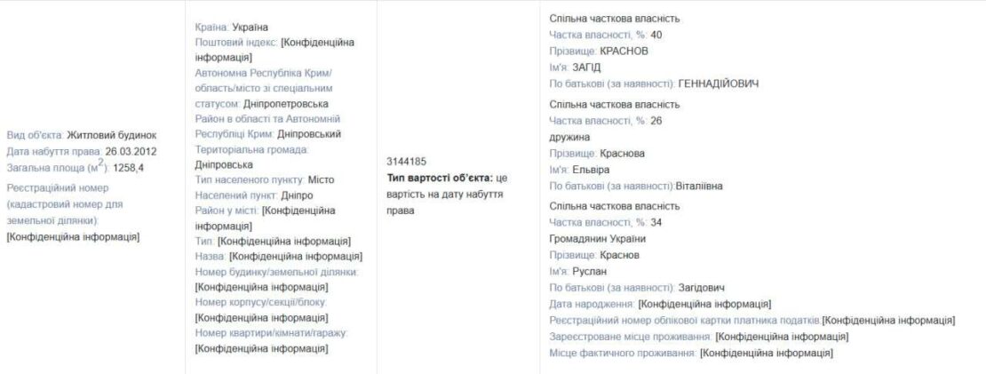 30 березня 2026 року депутат Дніпровської міської ради та лідер організації «Громадська сила» Загід Геннадійович Краснов подав щорічну декларацію за 2025 рік. У документі зазначено, що він разом із дружиною Ельвірою та сином Русланом володіє будинком у Дніпрі площею 1 258,4 кв. м.
