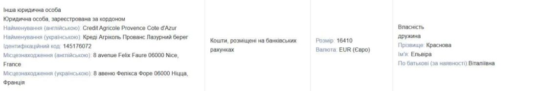 На дружину депутата зареєстрована квартира у Франції площею 65,19 кв. м, яку купили у липні 2023 року за 16 млн 048 тис. 734 грн. Адреса у декларації не вказана, але з огляду на рахунки дружини у французьких банках, один з яких Credit Agricole Provence Cote d’Azur у Ніцці, родині Краснових найпевніше могло сподобатися Лазурне узбережжя.