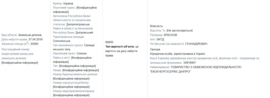 Згідно з даними декларації, Загіду Краснову належить 50% статутного капіталу компанії «Екоенергосервіс Дніпро» вартістю 35 млн грн. І саме ця компанія орендує його ділянки та надає автомобіль.