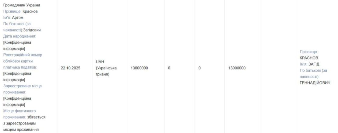 Крім того, у жовтні 2025 року Загід Краснов позичив 13 млн грн у власного сина Артема, й того ж дня депутат придбав акції на майже цю суму.